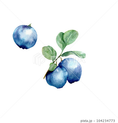 Watercolor Blueberry. Hand painted illustration of Blue Berry. Forest Plant with green leaves on white background. Sketch of Bilberry for design of business cards and invitations