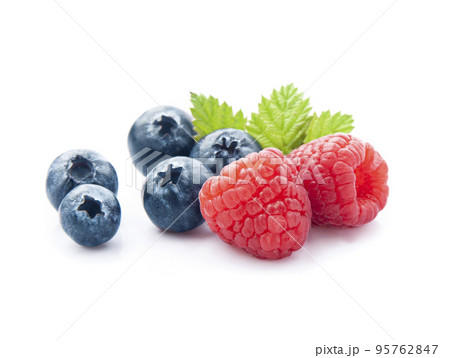 Sweet raspberry and blueberry with leaves on white backgrounds.