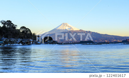 沼津市西浦から望む、海越しの冬の冠雪した富士山