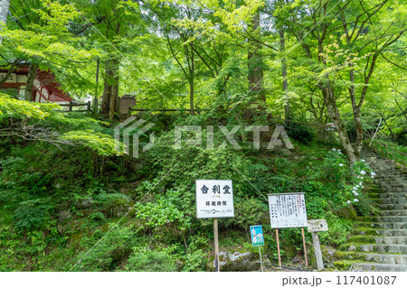 岐阜県揖斐川町 西美濃三十三霊場第一札所の新緑の横蔵寺の舎利堂への階段