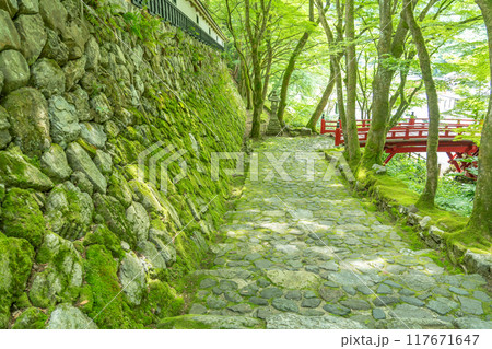 岐阜県揖斐川町 西美濃三十三霊場第一札所の新緑の横蔵寺の苔むした赤い橋