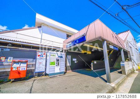 日本の横浜都市景観 8月。SOTETSU 西谷駅 南口などを望む。出入口わきにあるのは宅配便ロッカー