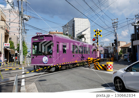 踏切を渡り嵐山方面行の西院駅へ入線する京福電気鉄道モボ501形電車嵐電502号 駅のホームより撮影