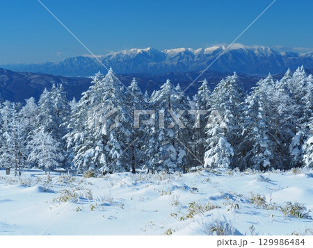 北八ヶ岳の樹氷の森と中央アルプスの遠望