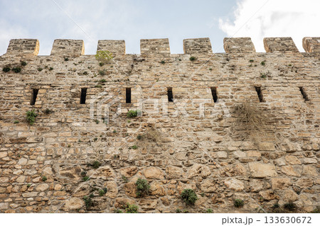 Ancient stone fortress wall with battlements and arrow slits under blue sky
