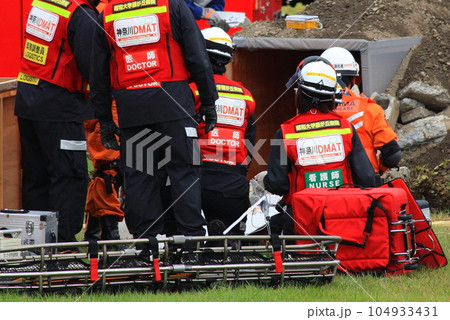 負傷者を搬送する陸上自衛隊の隊員(防災訓練)
