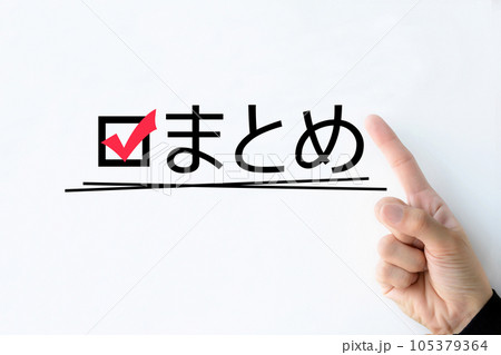 まとめの文字と指差しをする人物の手元