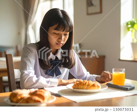 寝不足で朝の食卓で食欲がなく元気がなく下を向く女子中学生