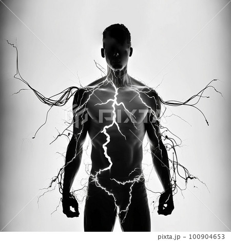 体に白い電流が走る堂々とした雰囲気の人のシルエット