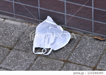 日本の横浜都市景観 街中で、ポイ捨てマスク(マスクの落とし物)が増加、ぺたんこに…=24日、横浜市内