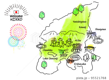 手書きの日光の観光地のシンプル線画イラストマップ