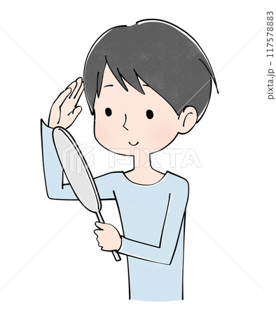 髪を見て笑顔になる若い男性のイラスト