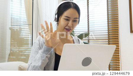 Happy asian woman use headphones listen to music online web conference sitting on cozy sofa in living room at home. Female asian people working at home research watching online e-learning video call