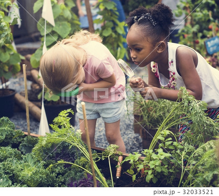 保育園児と小学生が虫眼鏡で覗いている