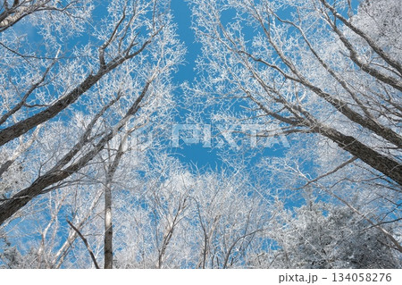 霧氷に包まれた木立を見上げる冬の青空 繊細な枝が描く透明感のある風景