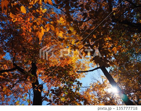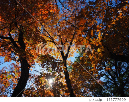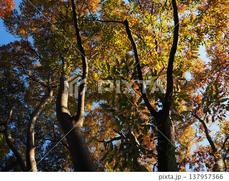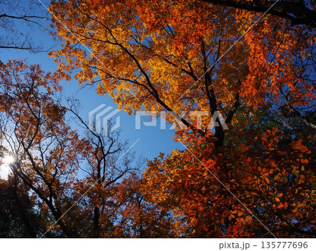 見上げた紅葉の天井が包む鮮やかな秋の森