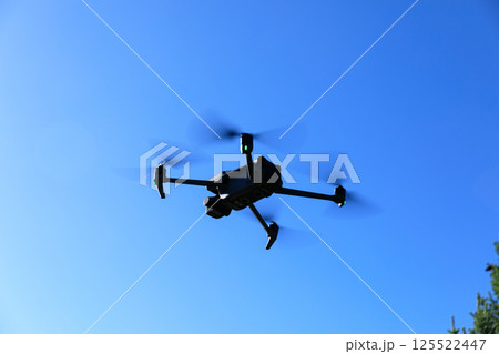 Black drone flying in sunrise blue sky
