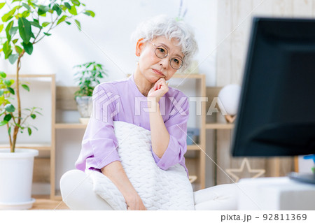 テレビを見て考えるシニア女性