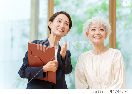 シニア女性に説明をするビジネスウーマン
