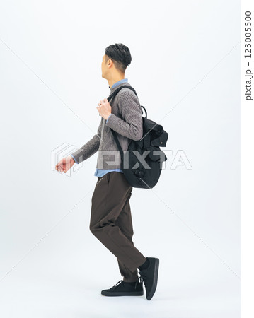 リュックを背負って歩くカジュアルウェアのミドル男性の全身写真