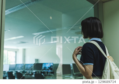 施設を見学する女性