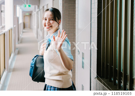 玄関で見送る家族に手を振る制服の女子高生