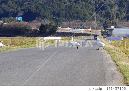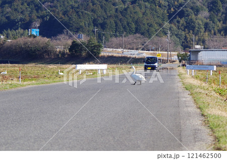 アスファルトで舗装された農道を自動車の往来に注意しながら向かい側の田んぼへ歩いて横断するコハクチョウ