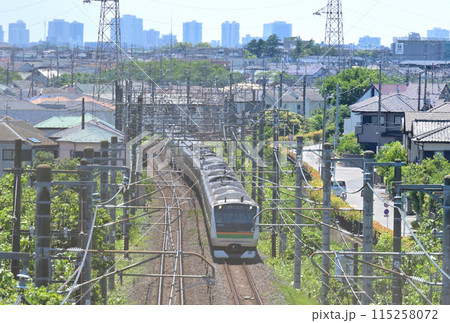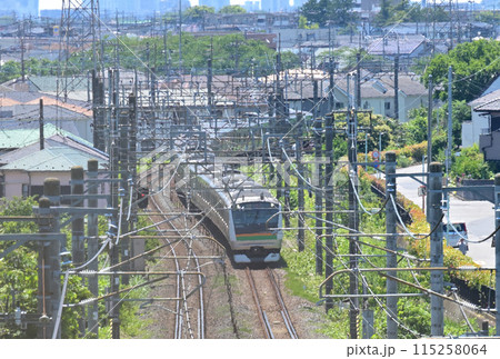 都市のビル群を背景に見るJR宇都宮線の通勤電車、E233系:埼玉県蓮田市