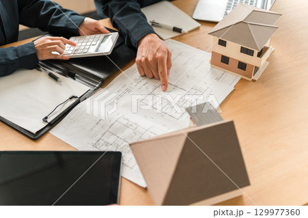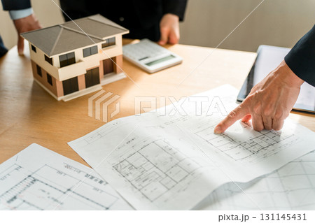 住宅模型,設計図の前で会議,ミーティングをするビジネスマン