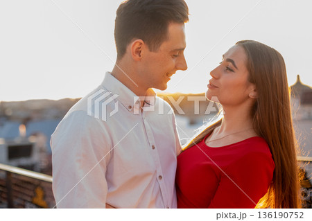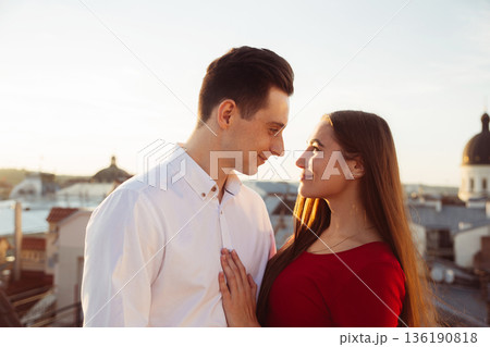Couple smiles at each other during sunset on a rooftop in the city while enjoying a romantic moment together