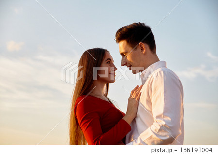 Couple enjoys a moment together during sunset while standing close on a clear evening