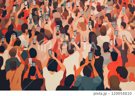 Crowd with mobile phones. Smartphone addiction problem, online life concept.