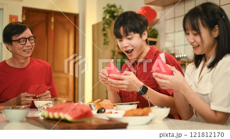 Cheerful family members opening red envelopes hongbao during a Chinese New Year celebration