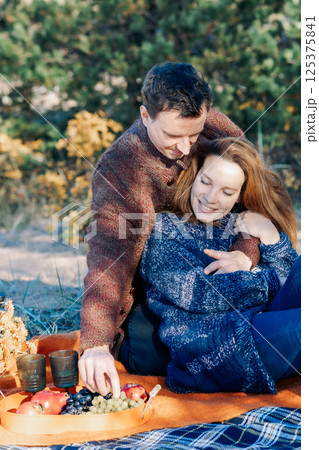 Portrait happy beautiful couple in love enjoying autumn picnic in autumn park. Vertical photo. High quality photo