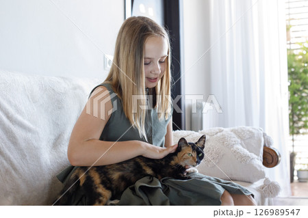 Young child girl with playful furry cat pet companion relaxing on cosy sofa indoor