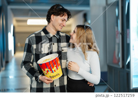 Couple enjoying popcorn while sharing a joyful moment in a cinema hallway