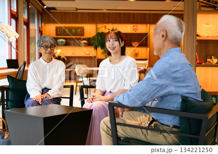 ホテルラウンジで会話する三世代
