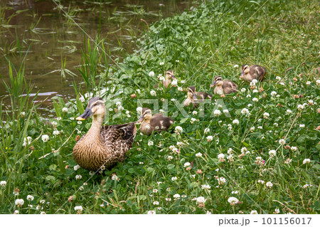 シロツメクサが咲く水辺を行進するカルガモ親子