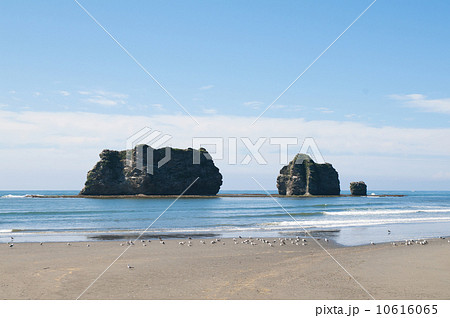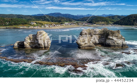 快晴の青空を背景にした北海道せたな町のシンボル親子熊岩 Ver2