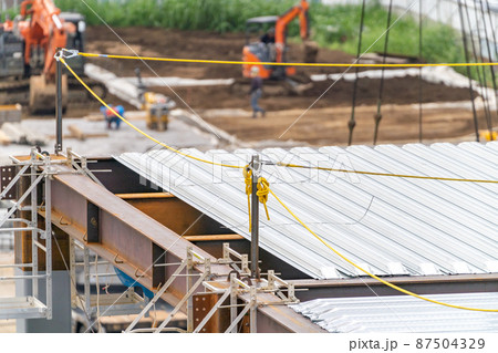 建設現場 鉄骨工事 デッキプレート 施工高所作業 とび 安全帯 ランヤード スタンション 親綱用支柱