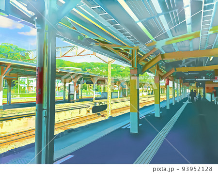 イラスト素材:田舎の駅ホームで電車を待つ女性、横顔