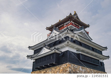 日本の愛知県の犬山市 春の犬山城と満開の桜 木曽川を進む遊覧船と美しい青空と花壇