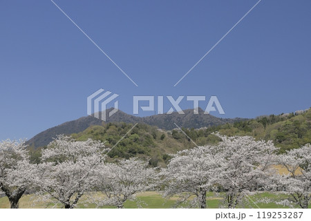 春の快晴の青空の、茨城県筑西市の母子島(はこじま)遊水池の満開の桜並木と筑波山