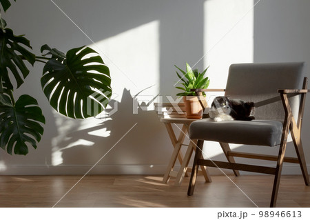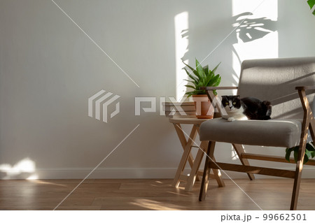 Scottish cat on gray chair in interior of living room. Homemade plans sansevieria, monstera, wooden decor. Light minimalistic scandinavian interior. Copy space
