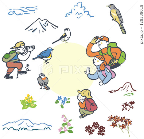 登山で自然を満喫する人々 セットのストックイラスト素材