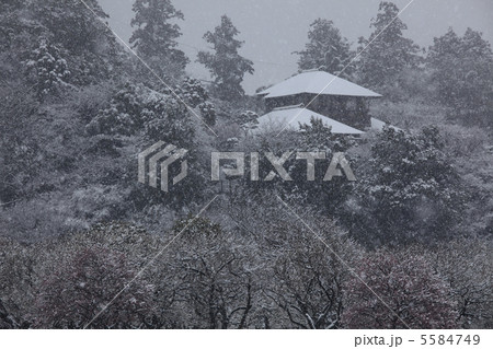 梅花に春雪舞う 静寂の偕楽園 好文亭を遙かに望む 人物なし