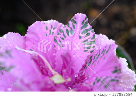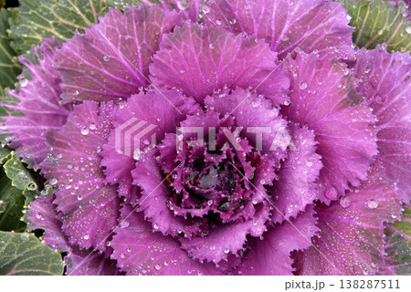 水滴をまとった観賞用ハボタンの緑紫混色葉のマクロ撮影