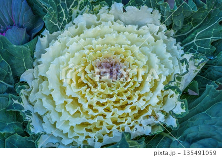 Decorative cabbage in purple and white blooms in autumn garden, cabbage leaves curl in soft layers, cabbage rosettes form floral shapes with textured foliage and natural earthy contrast