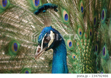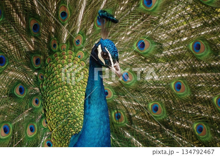 色鮮やかな目玉模様飾られた精巧な羽根インドクジャク2