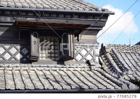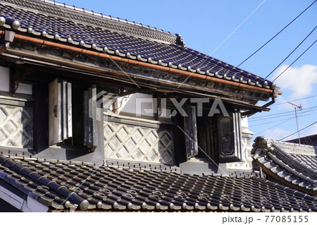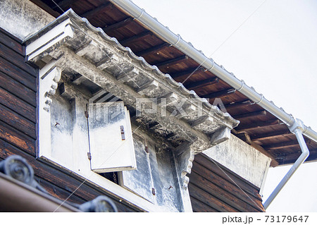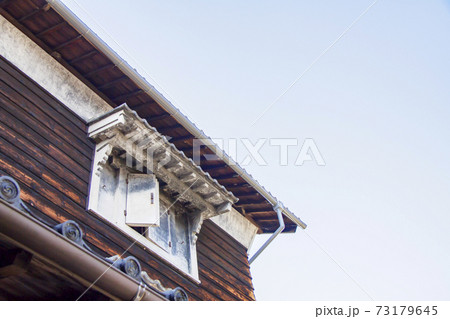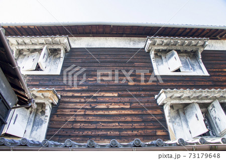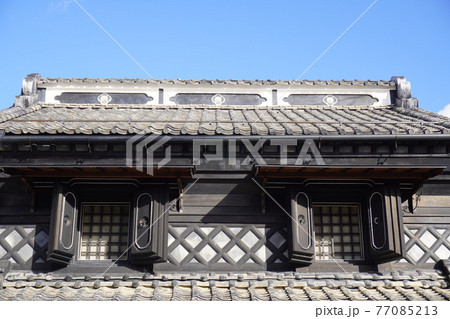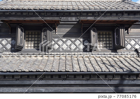 日本の蔵造りの建物、2階窓のクローズアップ(正面)